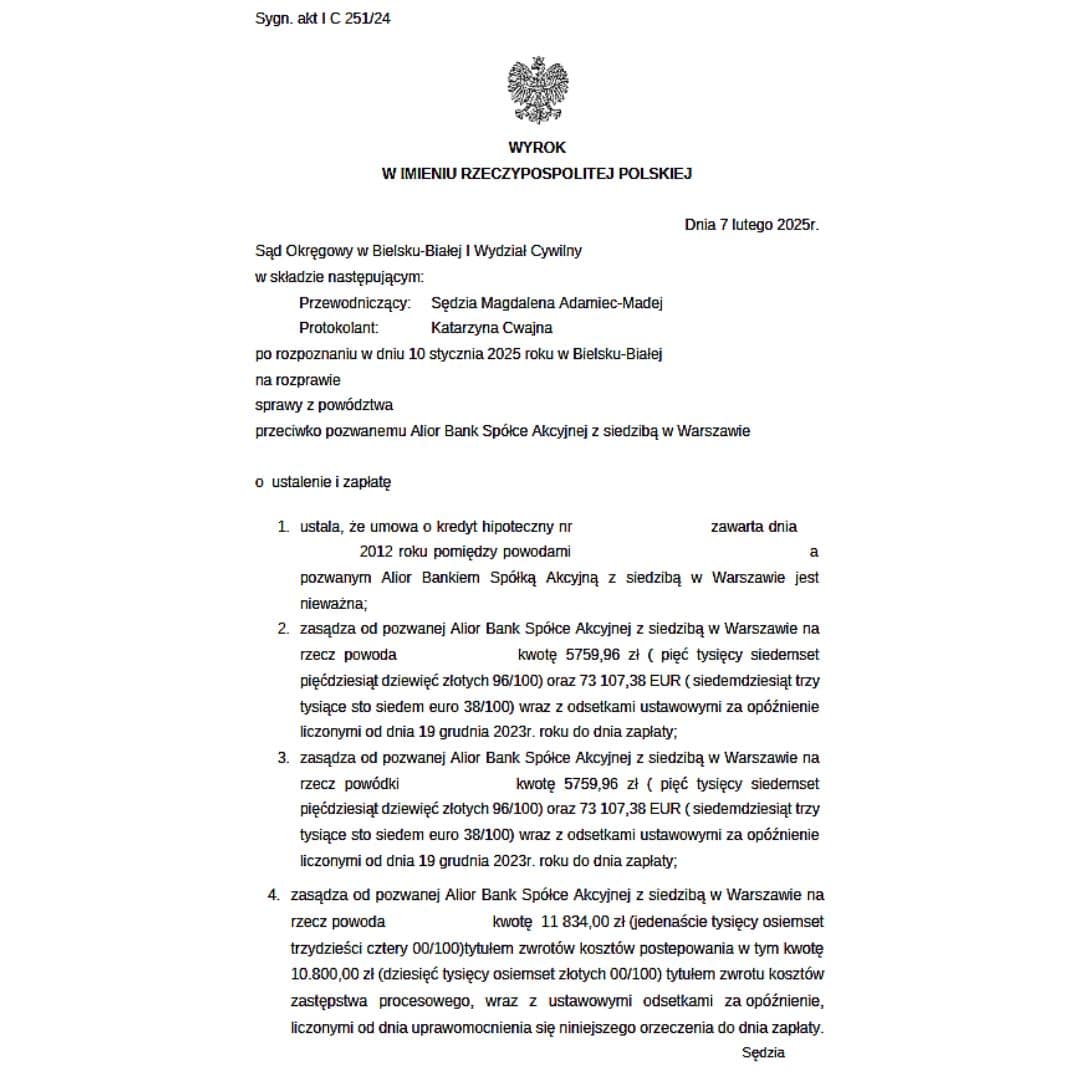Kobieta z Bytomia zawarła umowę kredytu denominowanego do euro w 2007 r. Spłacała go przez 14 lat. Adwokat z Katowic wykazał, że umowa zawierała nieprecyzyjny mechanizm przeliczeniowy i naruszała przepisy o klauzulach abuzywnych. Sąd Okręgowy w Gliwicach stwierdził nieważność umowy, zasądził na rzecz klientki 118 000 zł i oddalił powództwo banku o zwrot kapitału z powodu przedawnienia. Bank nie wniósł apelacji.